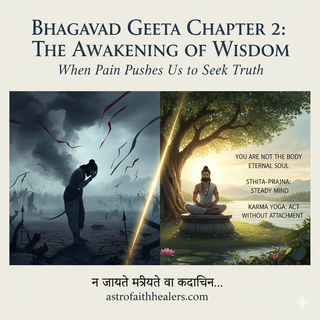 Bhagavad Geeta Chapter 2, known as “Sankhya Yoga”, begins exactly here — when despair has matured into surrender, and the soul becomes ready to listen.